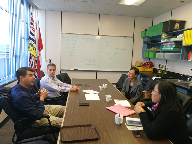 美加交流团首先抵达加拿大高贵林学区,对Como Lake School学校进行了交流考察。走进Como Lake School学校首先双方领导就两所学校之间的学校情况,办学理念,硬件设施,课程设置,教师情况进行了深入的探讨和交流。接着我校的三位老师走进课堂感受丰富多彩的课程设置,Como Lake School学校除了常规性的课程外,还为学生开设各种兴趣课程,如烘焙课程,天才小时时间,服装设计课程等校本课程,帮助学生提高生活技能和发展兴趣爱好。