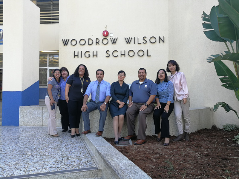 在美国洛杉矶参观了当地的一所私立中学 Emmus Luthern Middle School,就学校的校园文化建设和低年级部和高年级部的办学形式和管理方法分别进行了探讨和学习。在友好校伍德罗.威尔逊高中观摩学习期间,双方举行了见面交流会并签订了友好校协议书。在友好校重点对校园和课堂进行了全方位的观摩和参观,就对方学校的特殊教育,学生生涯规划课程,家长委员会建设重点进行了交流考察,并和老师、学生代表分别举行了座谈会。